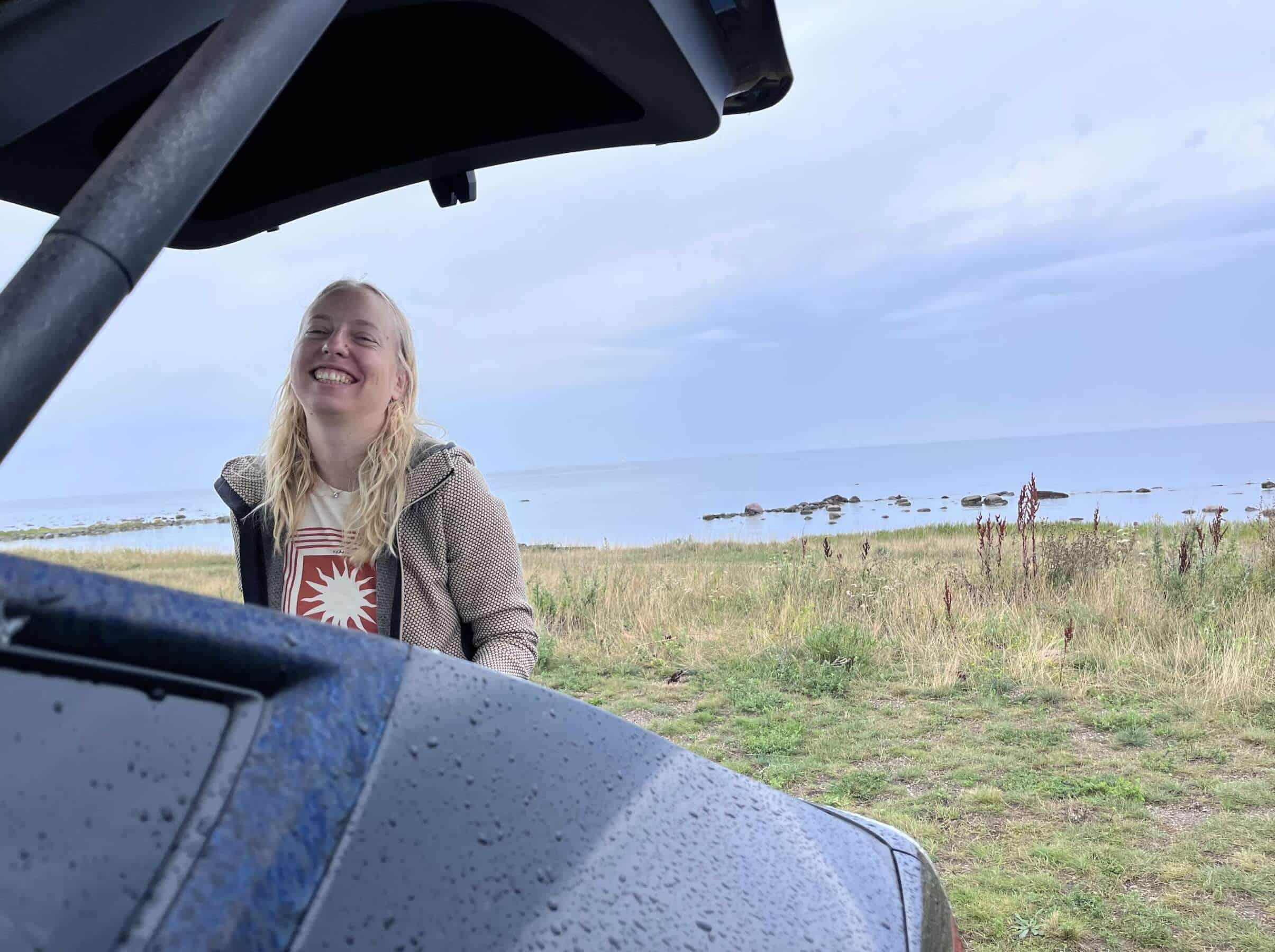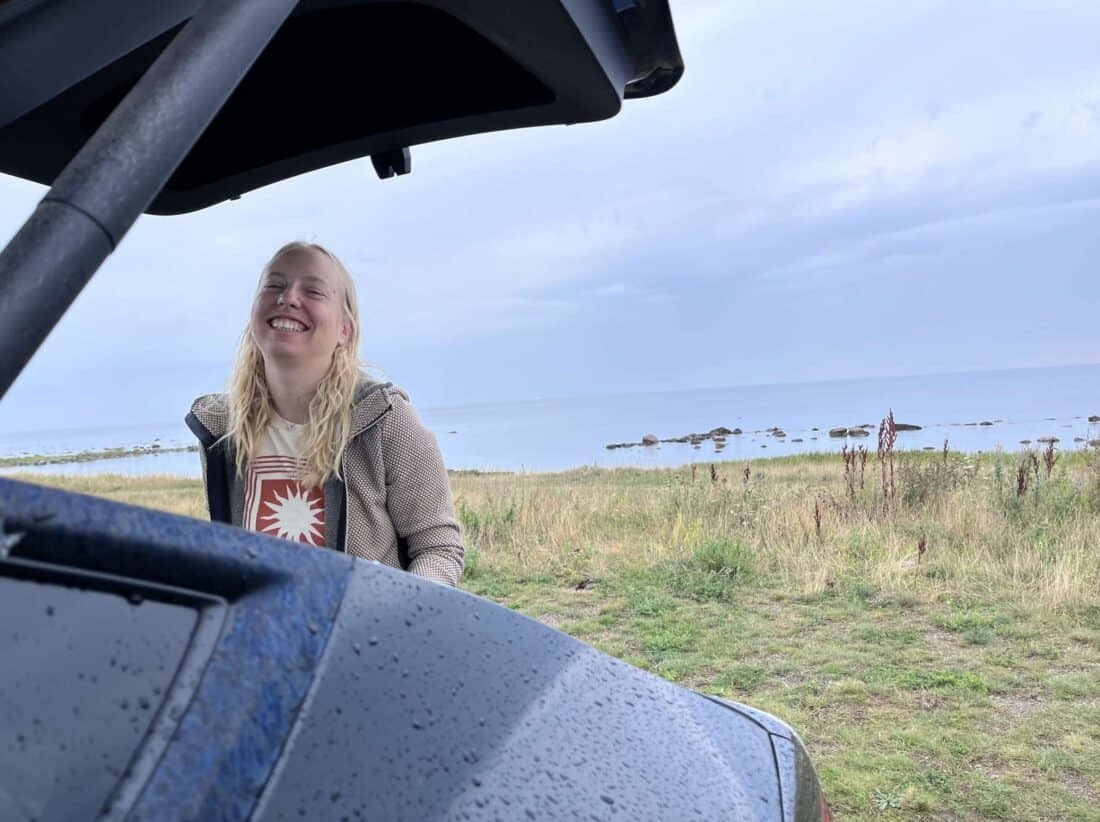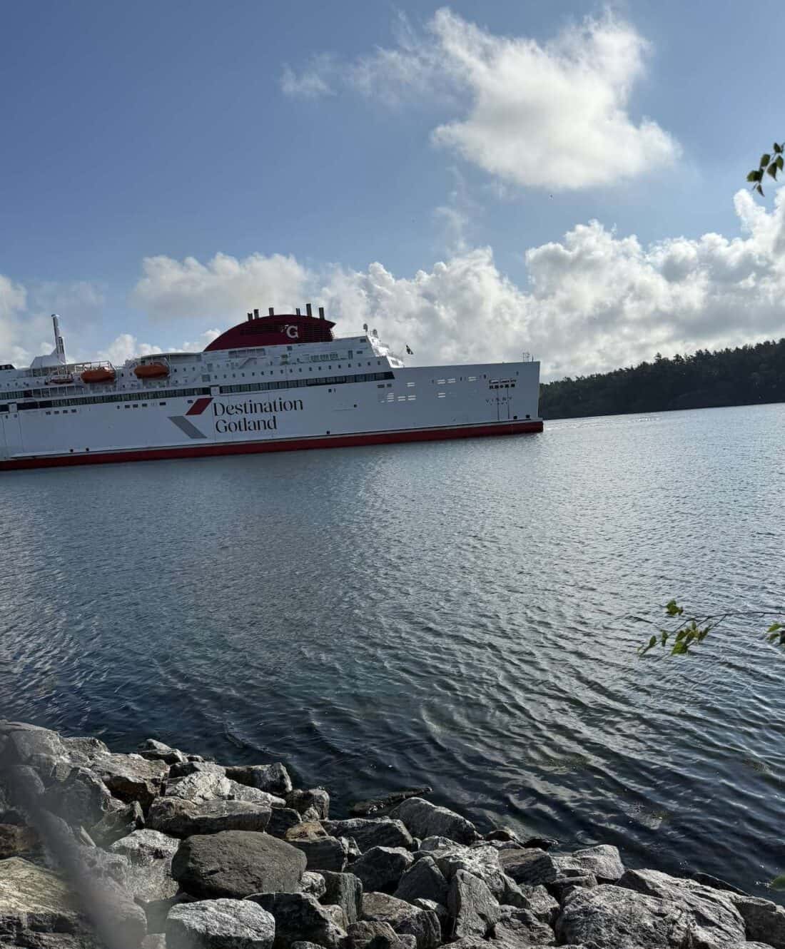 Naslednje jutro vstaneva zgodaj, prvič na potovanju na budilko. Piha in hladno je. V vrsti, kjer čakamo na trajekt za Gotland je kljub temu polno nasmejanih in srečnih obrazov. Gotalnd je ena izmed najbolj priljubljenih počitniških destinacij za domačine. Otroci se pretegujejo v pižamicah in lezejo z zadnjih sedežev avtombilov. Visoki svetlolasi Švedi in prav take Švedinje jih dvigujejo v naročje in jim z iztegnjeno roko kažejo res ogromen trajekt, v katerega buta razburkano morje. Vsem v vetru frfotajo lasje, še vedno močno piha.