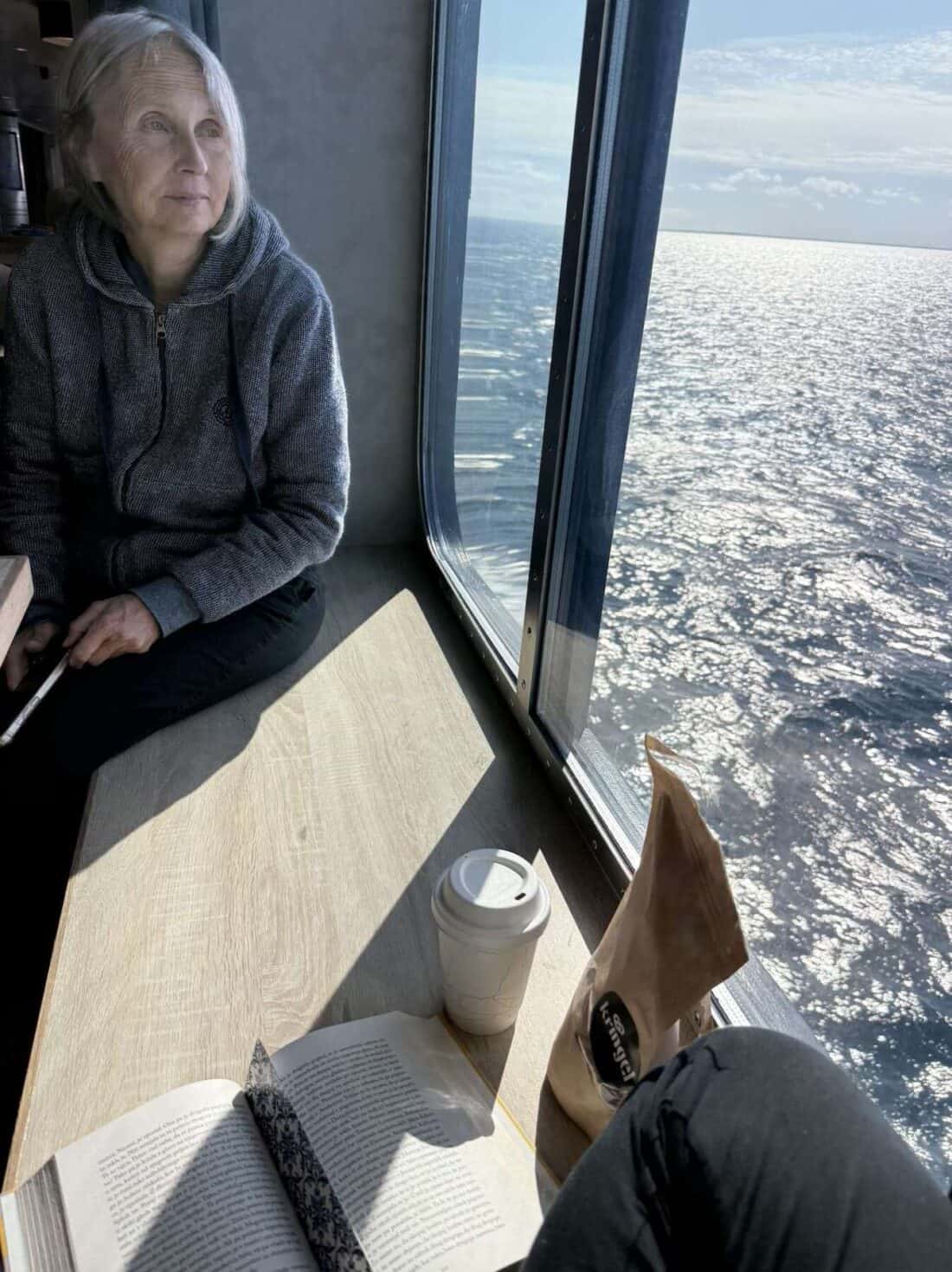 Trajekt spominja na luksuzne križarke. Kapitan po zvočniku sporoča, da smo polni do zadnjega kotička. (Nazaj grede je trajekt bolj prazen, v restavraciji in v spalnem delu sva lahko, kjer hočeva, gor nas je le 850, tako da ne vem, koliko potnikov je, kadar je trajekt poln).